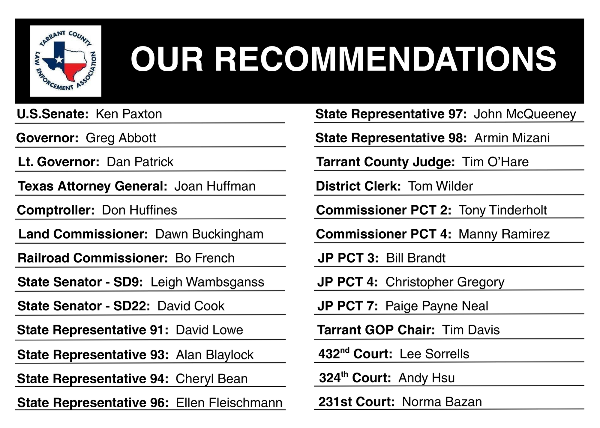 In the last election, all but one of our endorsed local candidates won the office they were running for. TCLEA stays very involved as an influencer of policy trends and actions which are in the best interest of our members. We also are active in working against policy/actions which can negatively impact our members. Our Political Action Committee (PAC) chaired by TCLEA President Ramon Garcia who is with the Tarrant County Sheriff's Office. Garcia is also a regional director for CLEAT.
