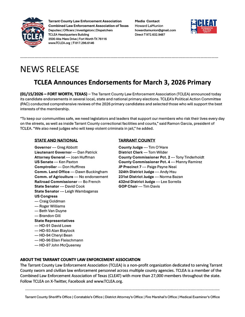 2026-01-15 ----- NEWS RELEASE / TCLEA ANNOUNCES POLITICAL ENDORSEMENTS FOR MARCH 3, 2026 PRIMARY