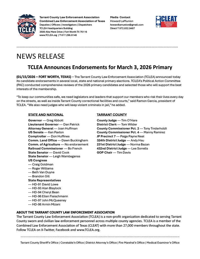 2026-01-15 ----- NEWS RELEASE / TCLEA ANNOUNCES POLITICAL ENDORSEMENTS FOR MARCH 3, 2026 PRIMARY